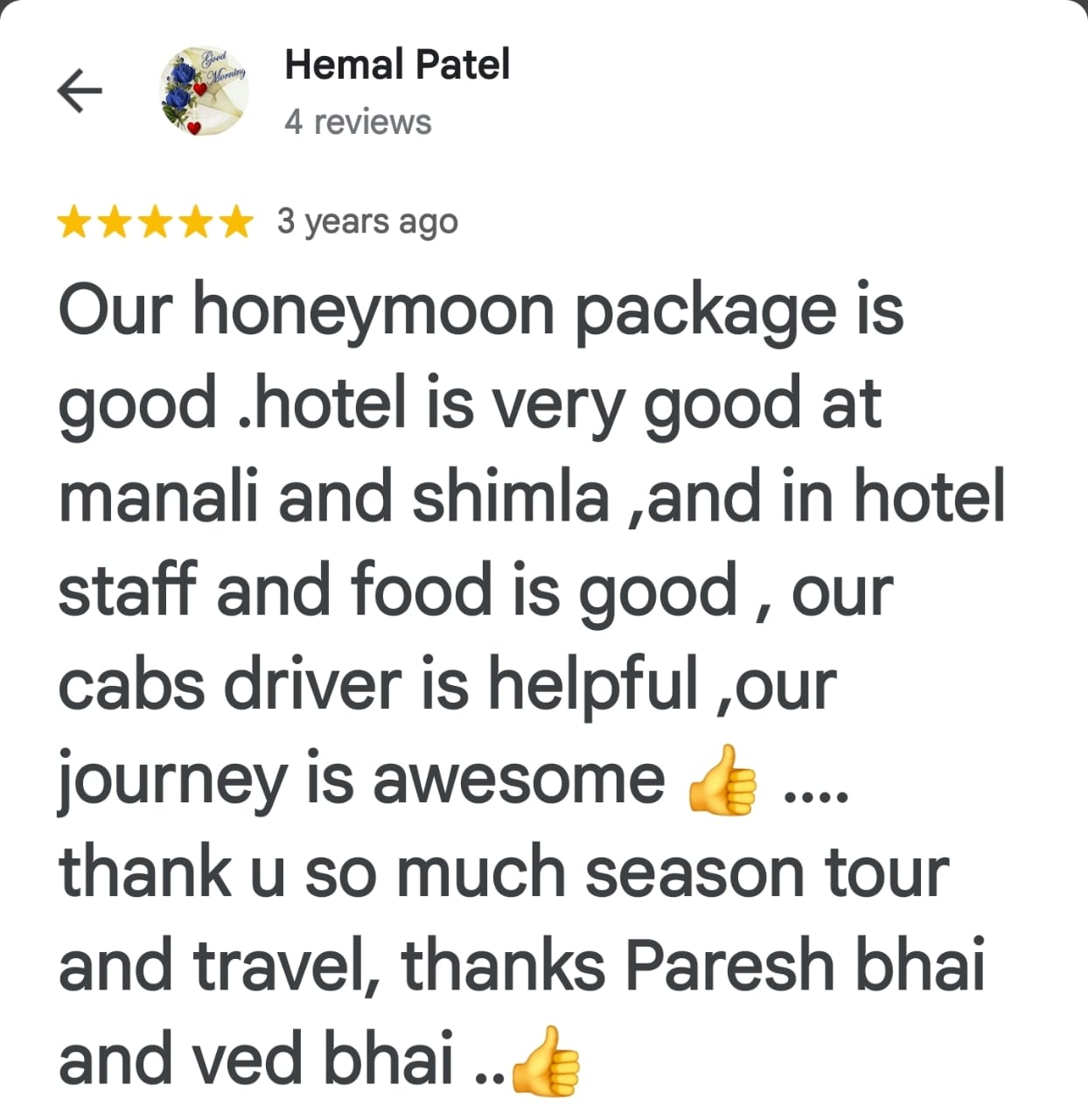 Our honeymoon package is good .hotel is very good at manali and shimla ,and in hotel staff and food is good , our cabs driver is helpful ,our journey is awesome π .... thank u so much season tour and travel, thanks Paresh bhai and ved bhai ..π β¦